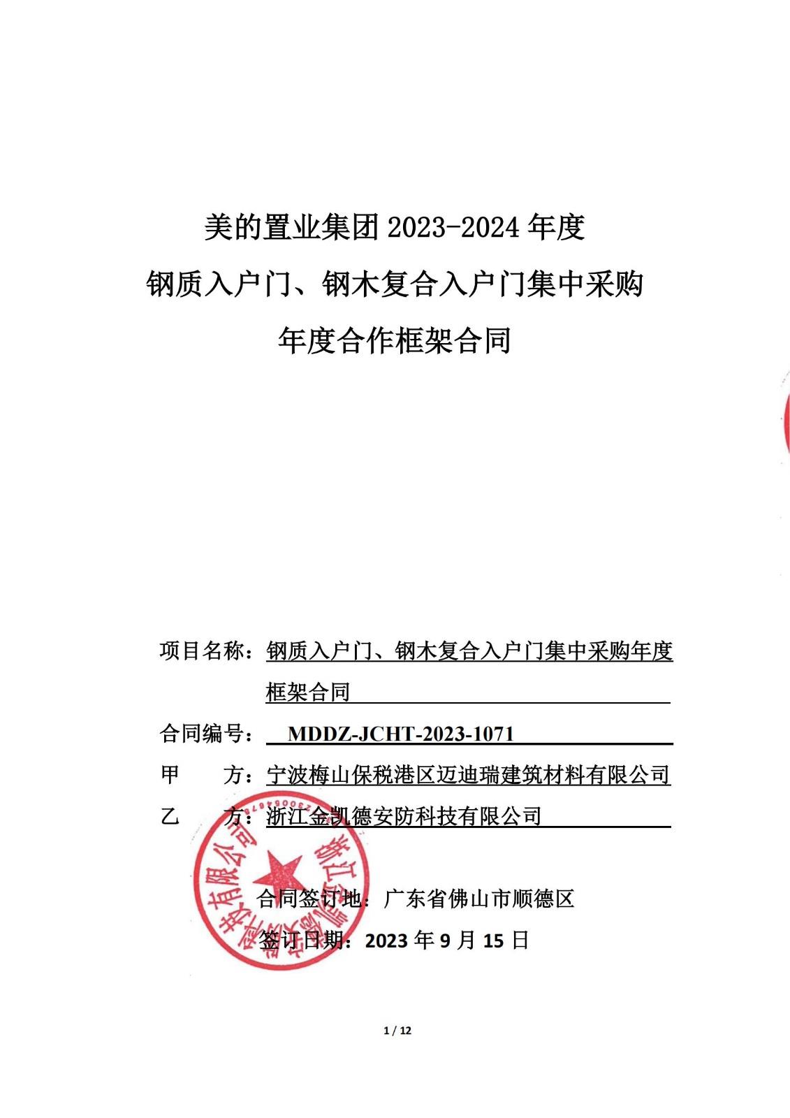 开发商名称: 美****团有限公司 战略合作名称: 美****团2023-2024年度钢质入户门、钢木复合入户门集中采购年度合作框架合同 战略合作类别: 钢木复合门 战略合作期限: 2023年09月14日至2024年12月31日 战略合作范围: 甲方确定乙方为美的置业集团2023-2024年度钢质入户门、钢木复合入户门集中采购中标单