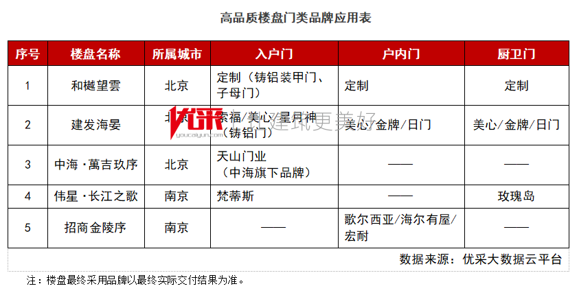 自有品牌与专业品牌并存。部分项目采用开发商旗下门业品牌,如北京中海·萬吉玖序采用中海旗下的天山门业产品,同时,专业细分品牌如玫瑰岛(厨卫门)、歌尔西亚、海尔有屋等也凭借产品力获得市场认可。