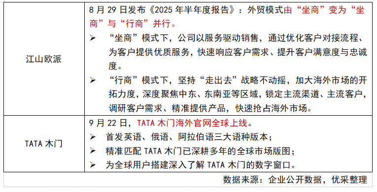 加速布局海外市场。江山欧派主动变革外贸模式,由“坐商”向“坐商+行商”并行转型,依托沙特欧派公司深耕中东与北非市场,通过香港公司统筹跨境贸易。TATA木门于9月上线全球官网,首发英语、俄语、阿拉伯语版本,覆盖欧美、东南亚、中亚及北非市场,构建全球化品牌窗口。