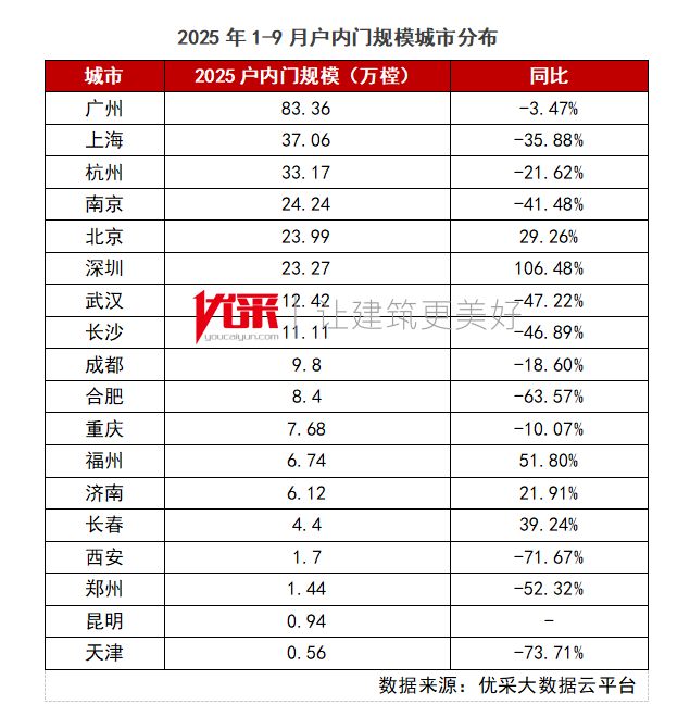 从区域分布看,一线城市凭借较高的全装修渗透率,继续占据规模主导地位。2025年1-9月,广州以83.36万樘的户内门需求量位居首位,上海(37.06万樘)、杭州(33.17万樘)紧随其后。
