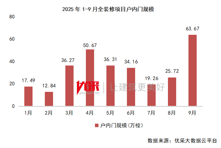在此背景下,全装修市场户内门需求总量同步收缩。2025年1-9月,重点18个城市全装修市场户内门规模296.39万樘,同比下降17.56%。从月度走势来看,需求呈现波动特征,9月单月需求达63.67万樘,为年内峰值,反映传统旺季对终端需求的阶段性拉动作用。
