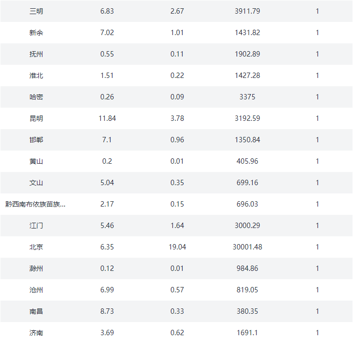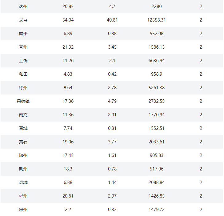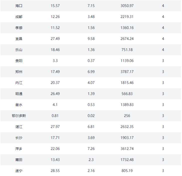 ③.三四线城市:沧州、东营、邯郸、肇庆、汕头、丽江、三亚、扬州、江阴、泰州、芜湖、漳州、九江、常熟、廊坊、保定、清远、张家港、昆山、镇江、宜兴、淮安、舟山、湖州、盐城、晋江、西宁、洛阳、宜昌、丽水、马鞍山、三明、衢州、义乌、秦皇岛、株洲、衡阳、岳阳、承德、韶关、遵义、德阳、海宁、慈溪、余姚、海门、启东、太仓、安庆、淮南、六安、桐乡、日照、邢台、张家口、常德、衡水、资阳、德清、嘉善、大厂、固安、儋州、陵水、香河、淳安、建德、桐庐、池州、益阳、定安、保亭、澄迈、万宁、燕郊、文昌、五指山、琼海(78)个