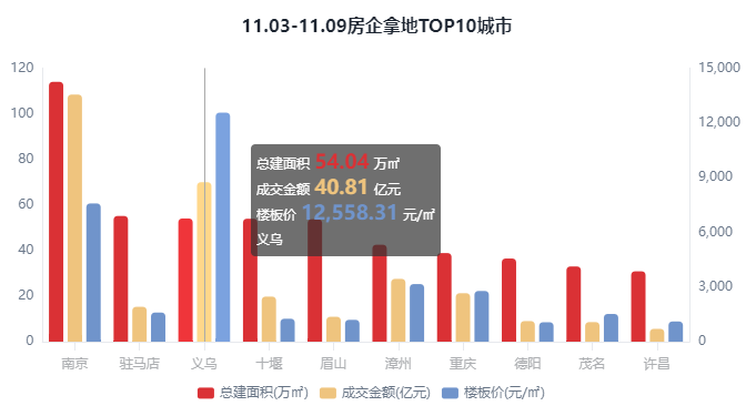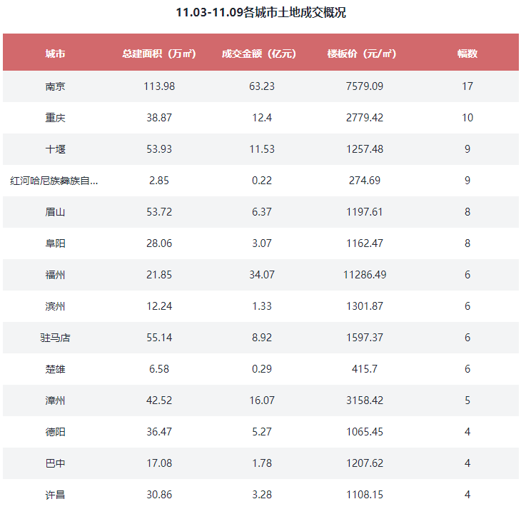 根据优采云平台监测的128城数据,本周土地成交幅数前三的城市分别南京113.98万㎡、驻马店55.14万㎡、义乌54.04万㎡。TOP3总建面积为223.16万㎡,环比减少25.63%,成交总价为112.95亿元,环比减少4.91%。
