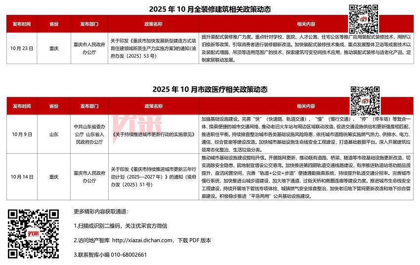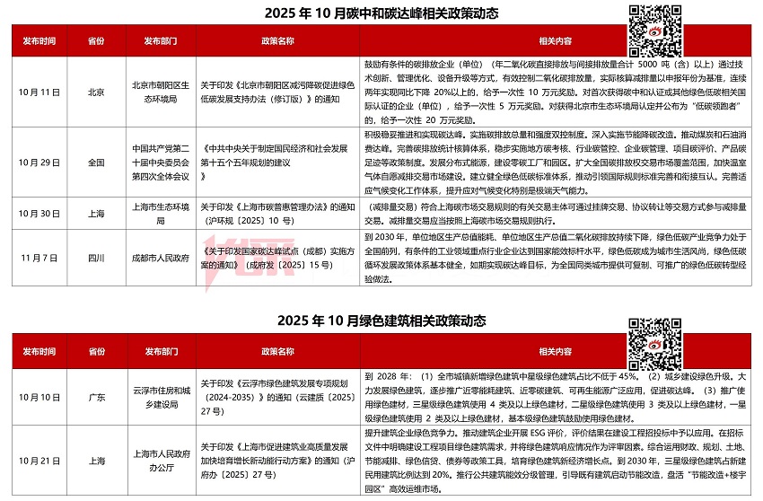 [摘要]2025年10月政策动态汇总来了!10月政策搜集17条。碳中和方面,“十五五”规划建议明确推进碳达峰,实现碳排放“双控”,北京朝阳区对获得碳中和认证和“低碳领跑者”企业给予奖励,上海允许通过挂牌、协议转让等方式参与减排量交易,成都要求到2030年实现单位GDP能耗与碳排放持续下降;绿色建筑方面,广东云浮提出到2028年星级绿色建筑占比不低于45%,上海将绿色建筑纳入招投标评审,成都要求提升建筑绿色水平;装配式方面,国家工信部将装配式构件纳入鼓励推广目录,上海推动装配式建筑与智能建造融合,重庆推广标准化设计和模块化建筑,广东明确2026年起居住用地100%实施装配式建筑,成都鼓励在乡村建设中采用装配式等新型建造方式;全装修方面,重庆针对学校、医院、人才公寓、住宅公区等推广应用装配式装修技术;市政医疗方面,山东和重庆持续推进城市更新,完善交通、管网、地下管线等基础设施。