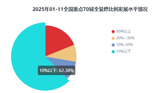 综上,2025年1-11月全国重点70城全装修项目规划建面为9554.05万㎡,全装修预证建面5737.74万㎡,预证建面占比40.6%。此外,全装修比例TOP10城市有7席是二线城市,全装修比例达到30%的城市占比为19%,未达到30%的城市占比为81%。