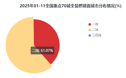 在全国重点70城全装修建面规模方面,2025年1-11月全装修建面TOP10城市有6席是二线城市,其中排在前三位的城市分别是广州1550.63万㎡、上海1078.71万㎡和佛山876.29万㎡。对比全装修建面在各分级城市的分布来看,二线城市全装修建面为5834.11万㎡,以61.06%占比居首位;一线城市全装修建面为3691.77万㎡,占比为38.64%次之; 三四线城市全装修建面28.17万㎡,占比仅为0.29%最少。