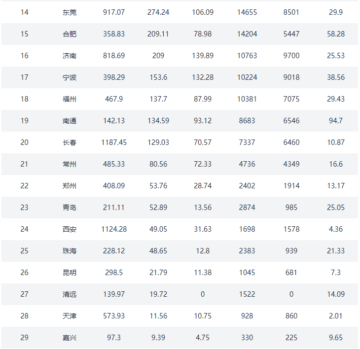 ②.二线城市:常州、成都、大连、东莞、佛山、福州、贵阳、海口、杭州、合肥、惠州、济南、嘉兴、金华、昆明、兰州、南昌、南京、南宁、南通、宁波、青岛、厦门、沈阳、石家庄、苏州、太原、天津、温州、无锡、武汉、西安、徐州、烟台、长春、长沙、郑州、中山、重庆、珠海(40)个