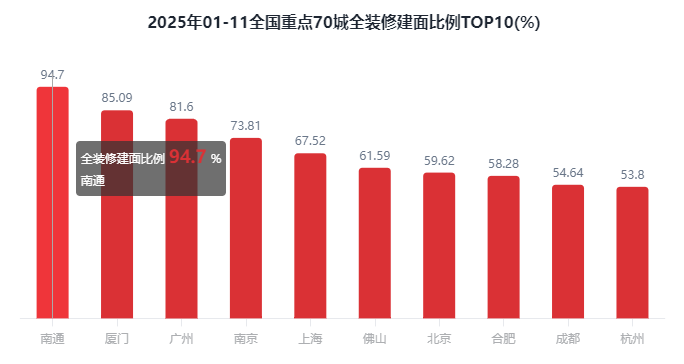在全国重点70城全装修建面比例方面,2025年1-11月全装修比例TOP10城市有7席是二线城市,其中排在前3位的城市分别是南通94.7%、厦门85.09%、广州81.6%。
