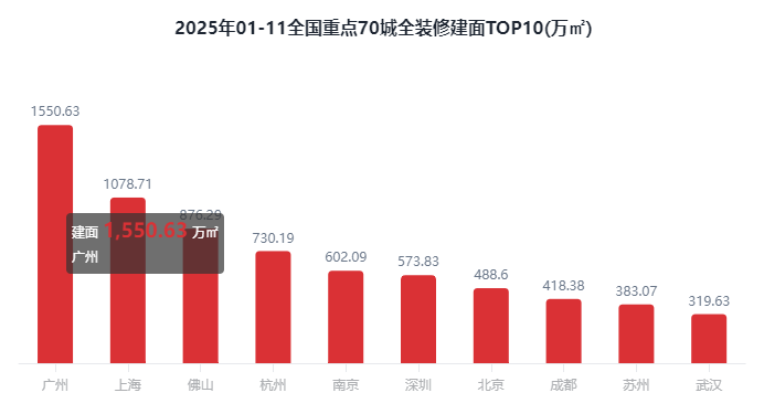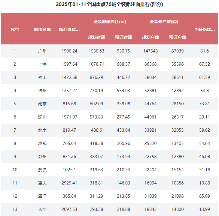 根据优采大数据云平台的监测数据,2025年1-11月全国重点70城新开盘建筑面积27750.94万㎡,全装修建筑面积9554.07万㎡,同比增加5.34%;全装修建筑户数70.2万套,同比增加2.69%;全装修建面比例为34.43%。其中,全装修建面排在前3位的城市分别为广州1550.63万㎡、上海1078.71万㎡、佛山876.29万㎡;全装修建面比例排在前3位的城市分别为南通94.7%、厦门85.09%、广州81.6%。