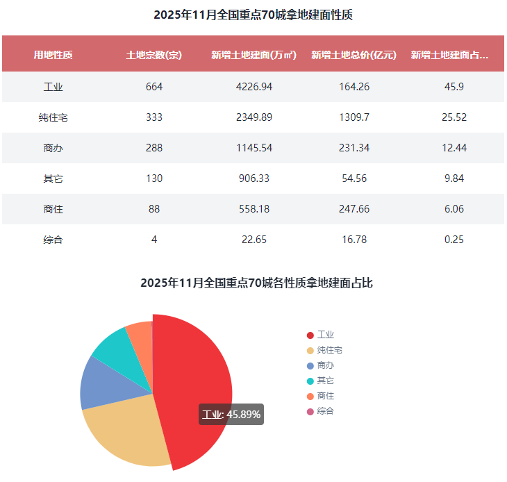 在全国重点70城城市新增土地建面性质方面,2025年11月土地市场共成交1507宗地块,比2024年11月同期增加97宗;新增土地建面9209.54万㎡,同比增加29.58%。其中,纯住宅用地333宗,新增土地建面2349.89万㎡,占比25.52%;商住用地88宗,新增土地建面558.18万㎡,占比6.06%;商办用地288宗,新增土地建面1145.54万㎡,占比12.44%。