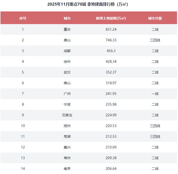 综上,2025年11月重点70城新增土地建面前10城市合计拿地4057万㎡,同比53.7%。