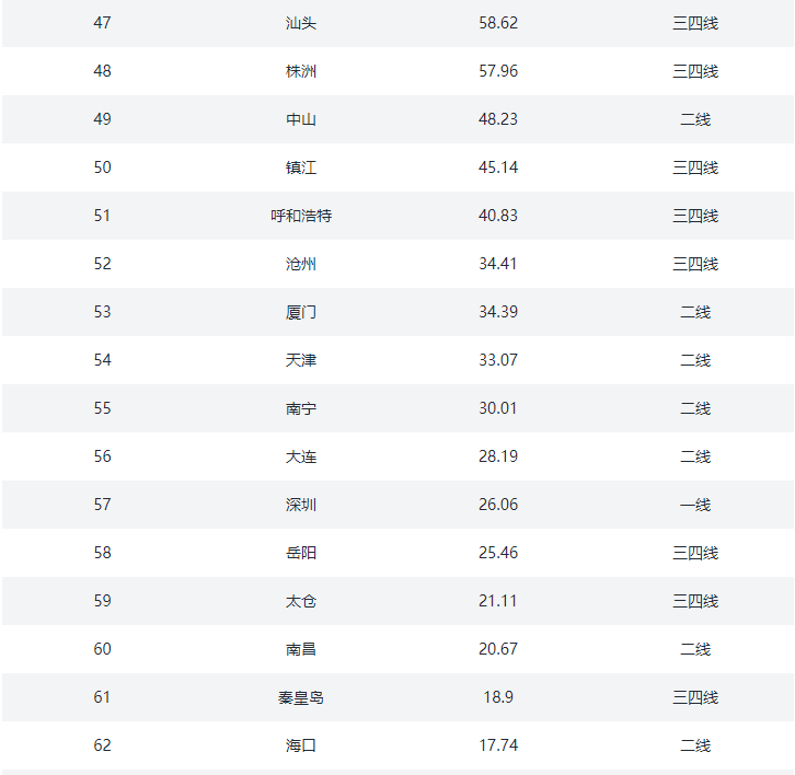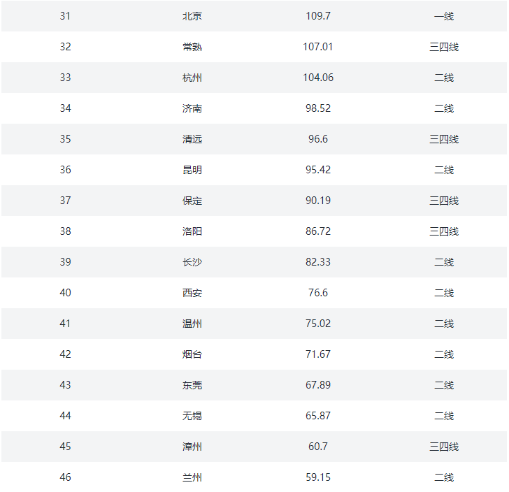 ②.二线城市:常州、成都、大连、东莞、佛山、福州、贵阳、海口、杭州、合肥、惠州、济南、嘉兴、金华、昆明、兰州、南昌、南京、南宁、南通、宁波、青岛、厦门、沈阳、石家庄、苏州、太原、天津、温州、无锡、武汉、西安、徐州、烟台、长春、长沙、郑州、中山、重庆、珠海(40)个