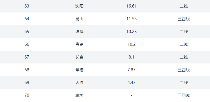 ③.三四线城市:保定、沧州、常德、常熟、衡阳、呼和浩特、湖州、昆山、廊坊、连云港、洛阳、秦皇岛、清远、汕头、上饶、台州、太仓、泰州、唐山、芜湖、扬州、岳阳、漳州、肇庆、镇江、株洲(26)个
