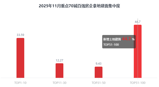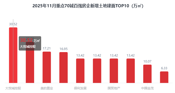 在百强房企新增土地建面方面,2025年11月新增土地建面前10房企合计拿地157.35万㎡,同比减少35.83%;其中前10房企有4家是TOP1-10梯队房企,排在前三位的房企分别是大悦城控股30.52万㎡、滨江集团22.59万㎡和美的置业17.21万㎡。