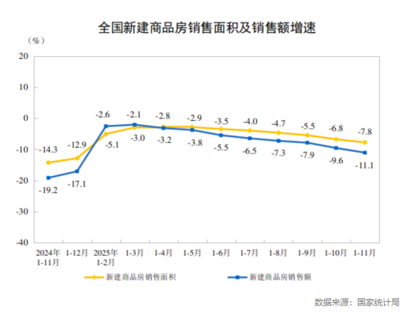 2025年1-11月房地产市场继续保持调整,商品房销售面积和销售额下降速率有所收敛。根据国家统计局数据,1-11月新建商品房销售面积78702万㎡,同比下降7.8%;新建商品房销售额75130亿元,同比下降11.1%。相较于2024年同期,跌幅分别收窄6.5个和8.1个百分点。这意味着市场整体仍处于深度调整期,多项核心指标呈同比下降态势,但“去库存”优化迹象已开始显现。
