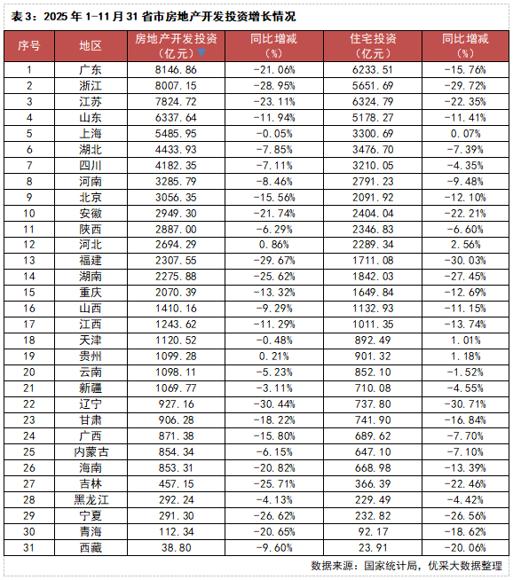 根据国家统计局数据,2025年1-11月,31省市房地产开发投资78591亿元,同比下降15.9%;其中,住宅投资60432亿元,下降15.0%。投资额排名前三的分别是广东、浙江和江苏,分别为8146.86亿元、8007.15亿元和7824.72亿元,投资额均在7500亿以上。西藏投资额最低,仅为38.80亿元。