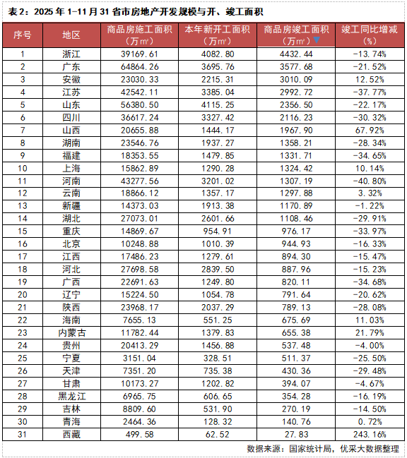 新开工面积方面,31省市1-11月房屋新开工面积共53457万㎡,同比下降20.5%;排名前三的是山东4115.25万㎡、浙江4082.80万㎡和广东3695.76万㎡。竣工面积方面,31省市1-11月房屋竣工面积共39454万㎡,同比下降18.0%;排名前三的是浙江4432.44㎡、广东3577.68万㎡和安徽3010.09万㎡。