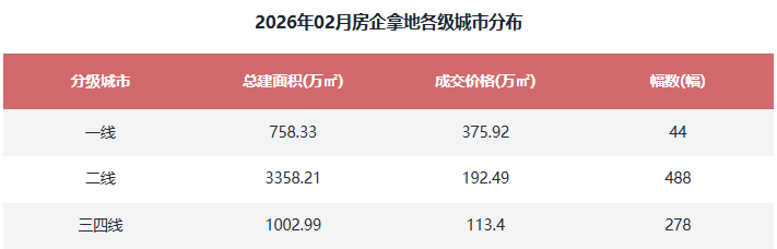 根据优采大数据云平台监测的房企拿地数据,2026年2月一线城市总建面积758.33万㎡,占比14.81%;二线城市总建面积3358.21万㎡,占比65.6%;三四线城市总建面积1002.99万㎡,占比19.59%。