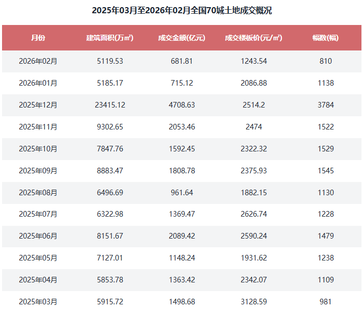 根据优采大数据云平台监测的土地数据,2026年2月全国70城经营性土地数据共成交810幅,环比-28.82%;成交建筑面积5119.53万㎡,环比-1.27%;成交总价681.81亿元,环比-4.66%。